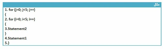 في كل عدة بالنسبة للـ (for) في الخطوة رقم (1) تعد (for) في خطوة رقم (2) من الصفر الى الاربعة وتنفذ Statement2 خمس مرات وبعدها ينفذ Statement1 مرة واحدة لكل عدة.