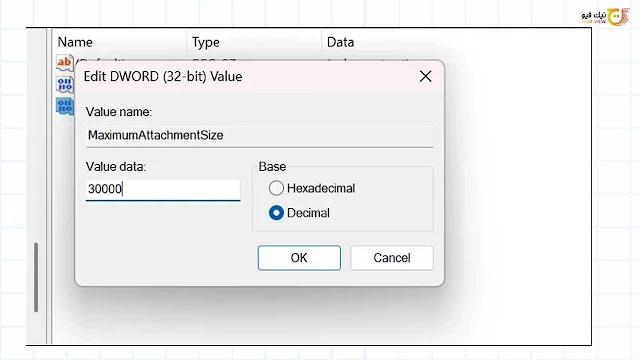 انقر نقرًا مزدوجاً فوق ملف DWORD MaximumAttachmentSize وأدخل حجم المرفق الذي تريد إرساله في القيمة. إذا كنت تريد إرسال ملف بحجم 28 ميجابايت، فأدخل 29000 أو 30000 لإرساله دون أي مشاكل. غيّر الأساس إلى عشري . أدخل القيم المطلوبة وانقر فوق موافق للحفظ.